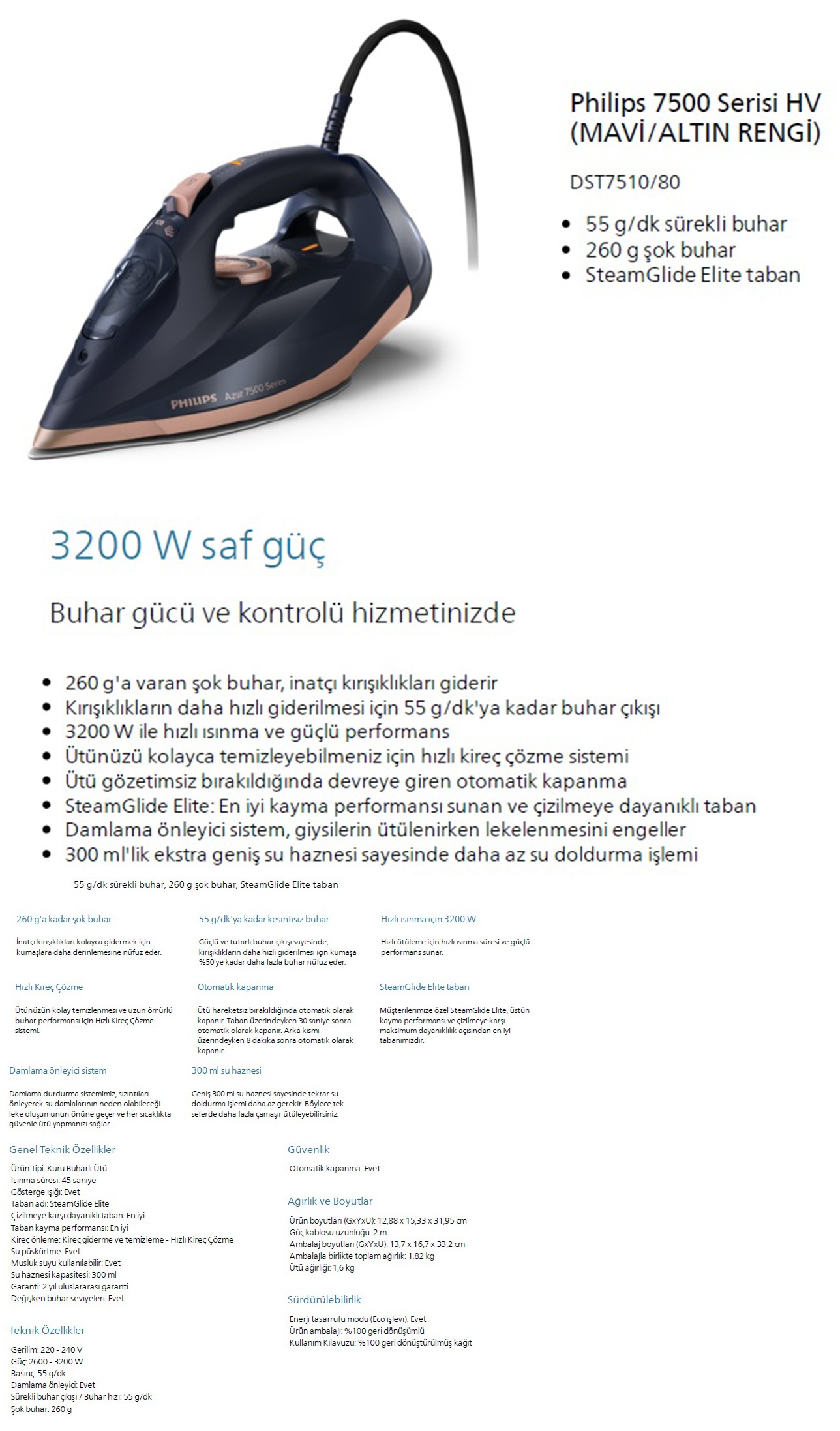 Philips Azur DST7510/80 7500 Serisi 3200 W Buharlı Ütü